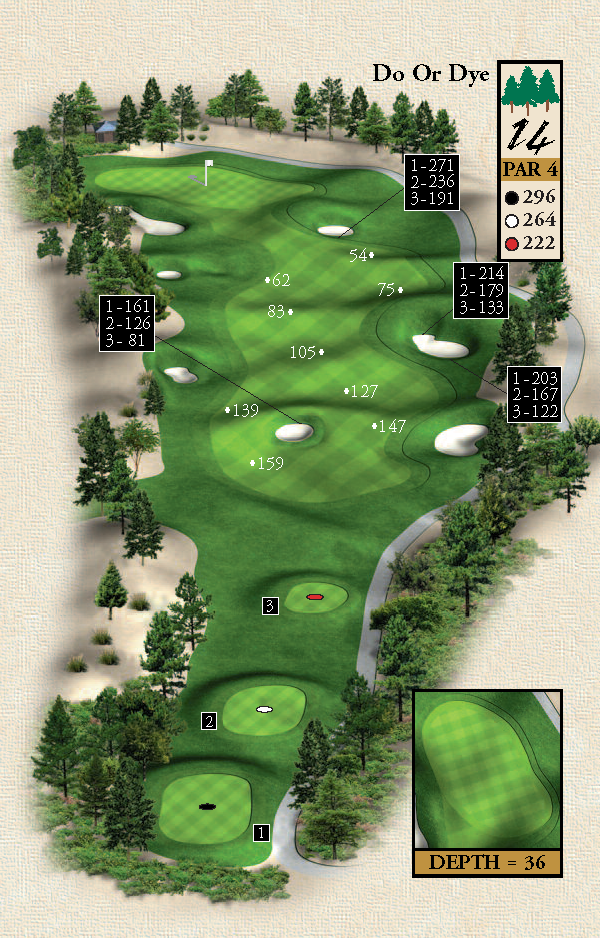 The iconic Dye Design genius is reflected in every adventurous twist and mischievous turn, with white sand bunkers protecting large, undulating “Dye-abolical” Bentgrass greens and more than 3,500 mature pine trees framing lush rolling greens – transporting golfers from the glitz and glamour of the casinos to the timeless Carolina sand hills.